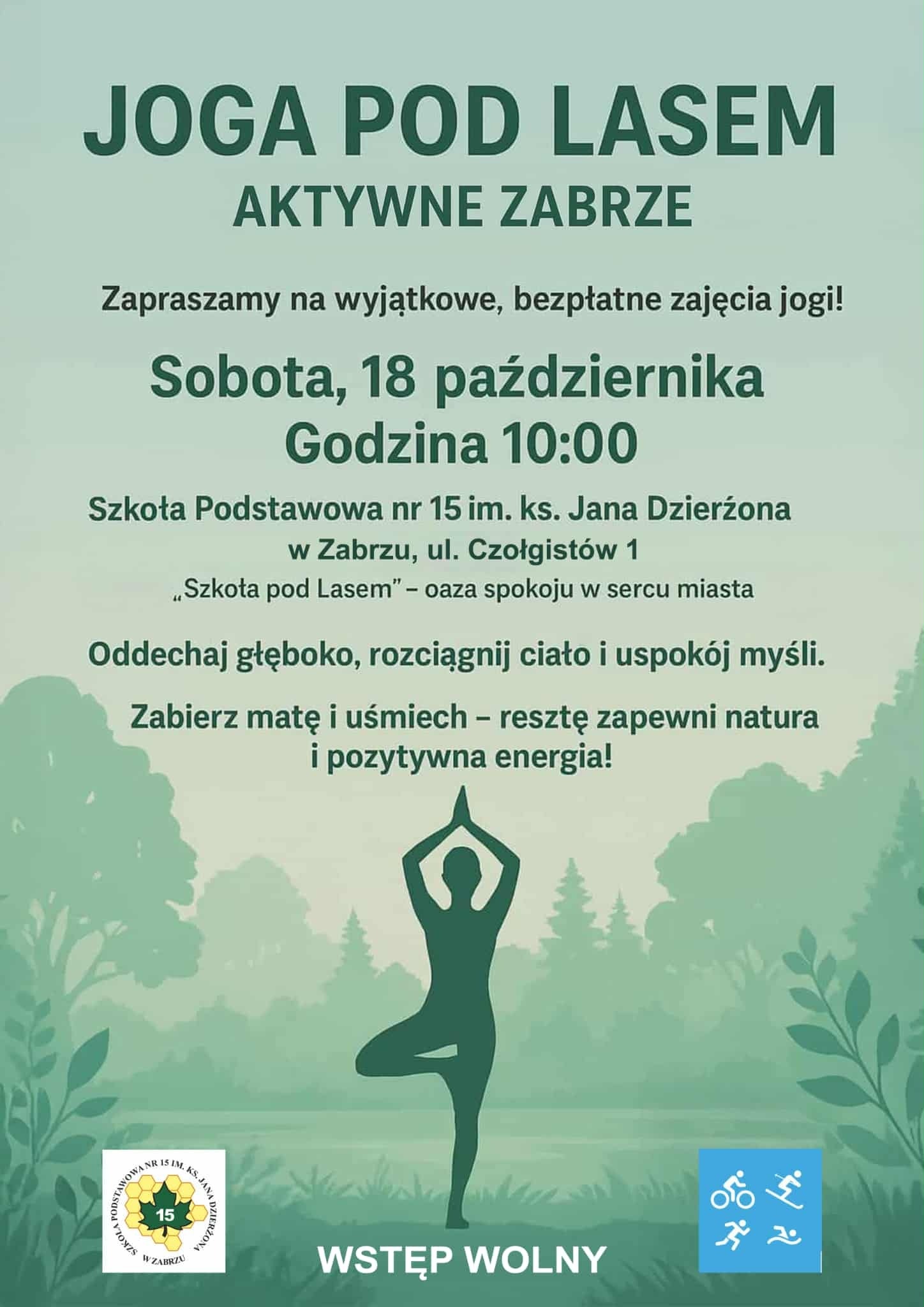 Aktywne Zabrze zaprasza na "Jogę pod lasem", bezpłatne zajęcia jogi! Sobota, 18 października Godzina 10:00 Szkoła Podstawowa Nr 15…