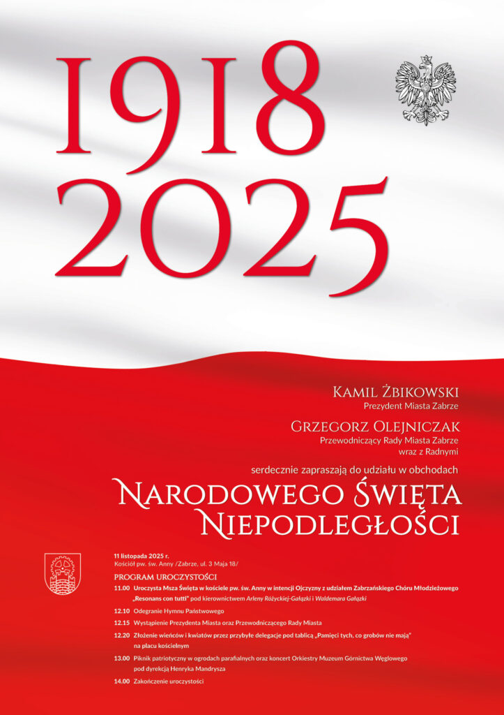 07/11/2025 Wyłączono przez Maja GiryckaPrezydent Miasta Zabrze Kamil Żbikowski i Przewodniczący Rady Miasta Zabrze Grzegorz Olejniczak wraz z Radnymi serdecznie zapraszają do udziału w obchodach Narodowego Święta Niepodległości 11 listopada 2025 r. w kościele pw. św. Anny, przy ulicy 3 Maja 18.