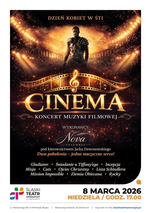 25/02/2026 Wyłączono przez adminŚląski Teatr IMpresaryjny im. Henryka Bisty w Rudzie Śląskiej zaprasza 8 marca 2026 /niedziela/ godz. 17.00 na DZIEŃ KOBIET w ŚTI, CINEMA, koncert muzyki filmowej w wykonaniu NOVA Ensemble.