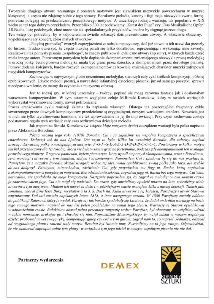 Wyjątkowy koncert poświęcony wariacjom, parafrazom i muzycznej fantazji wielkich kompozytorów. W programie utwory twórców rosyjskich oraz kompozycje i transkrypcje Ryszarda Borowskiego, ukazujące, jak z prostej melodii może powstać bogaty, wirtuozowski świat dźwięków.