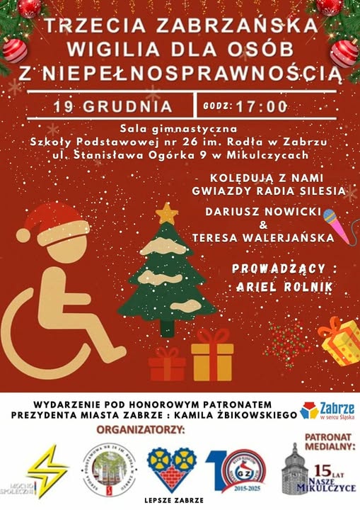 19-go grudnia o godz. 17:00 w Szkole Podstawowej nr 26 im. Rodła w Zabrzu odbędzie się już trzecia, Zabrzańska Wigilia Dla Osób z Niepełnosprawnością.