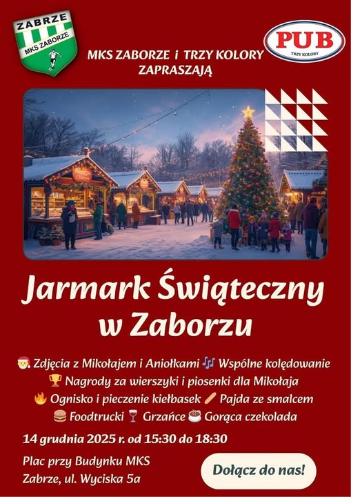 MKS Zaborze ul. Wyciska 5, ZabrzeJuż w niedzielę – 14 grudnia – odbędzie się Jarmark Świąteczny przy budynku MKS Zaborze Zabrze ul. Wyciska 5a! Start…